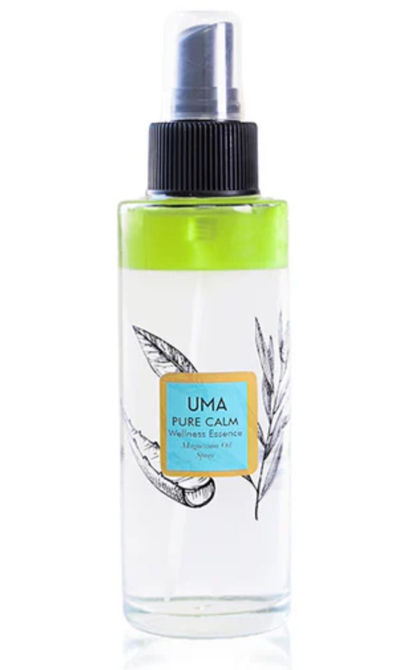 Topical magnesium helps more for sore muscles, while oral magnesium is said to work better for sleep. I take 3 magnesium threonate capsules before bed, and I also massage my feet with this gorgeous magnesium spray from UMA. Founder Shrankhla Holecek gave me the best tip re any topical you’re wanting to absorb: get in between your toes, where your skin is thinnest.