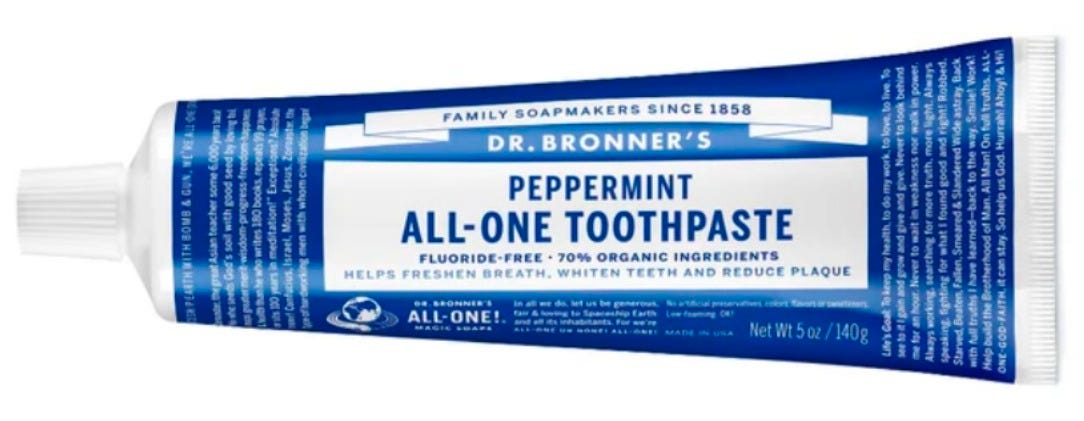 The most “editorial” toothpaste ever. Dr. Bronner’s is as at-home in a spotlessly preserved Richard Neutra masterpiece as it would be in the most ramshackle abandoned palace in World of Interiors.
